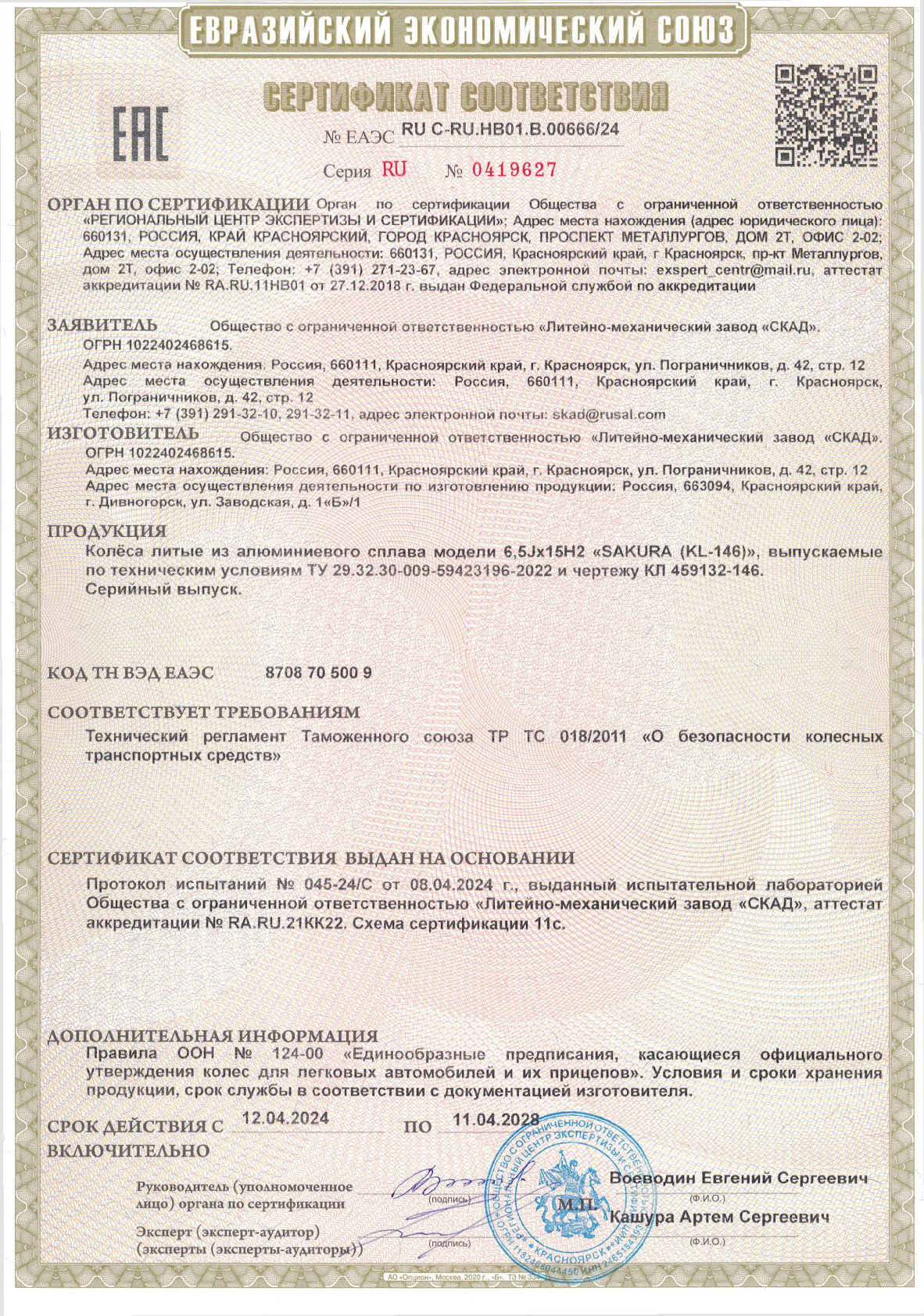 Приобретайте диски SKAD SAKURA 6.500xR15 5x114.3 DIA67.1 ET43 напрямую от производителя из Сибири. Все представленные в ассортименте диски сертифицированы.